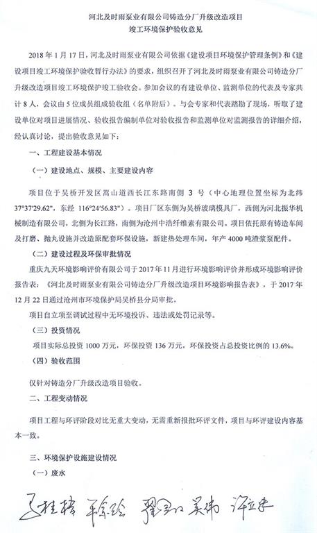 河北及時雨泵業(yè)有限公司鑄造分廠升級改造項目竣工環(huán)境保護(hù)驗收意見公示-河北及時雨泵業(yè)有限公司